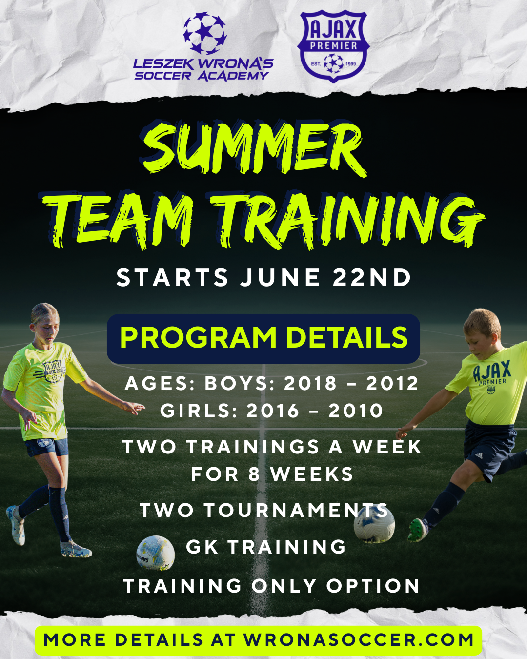 AJAX PREMIER is a competitive 11-month premier program, centered around player development. Teaching players the basic fundamentals of the game, receiving, dribbling, passing, and shooting.